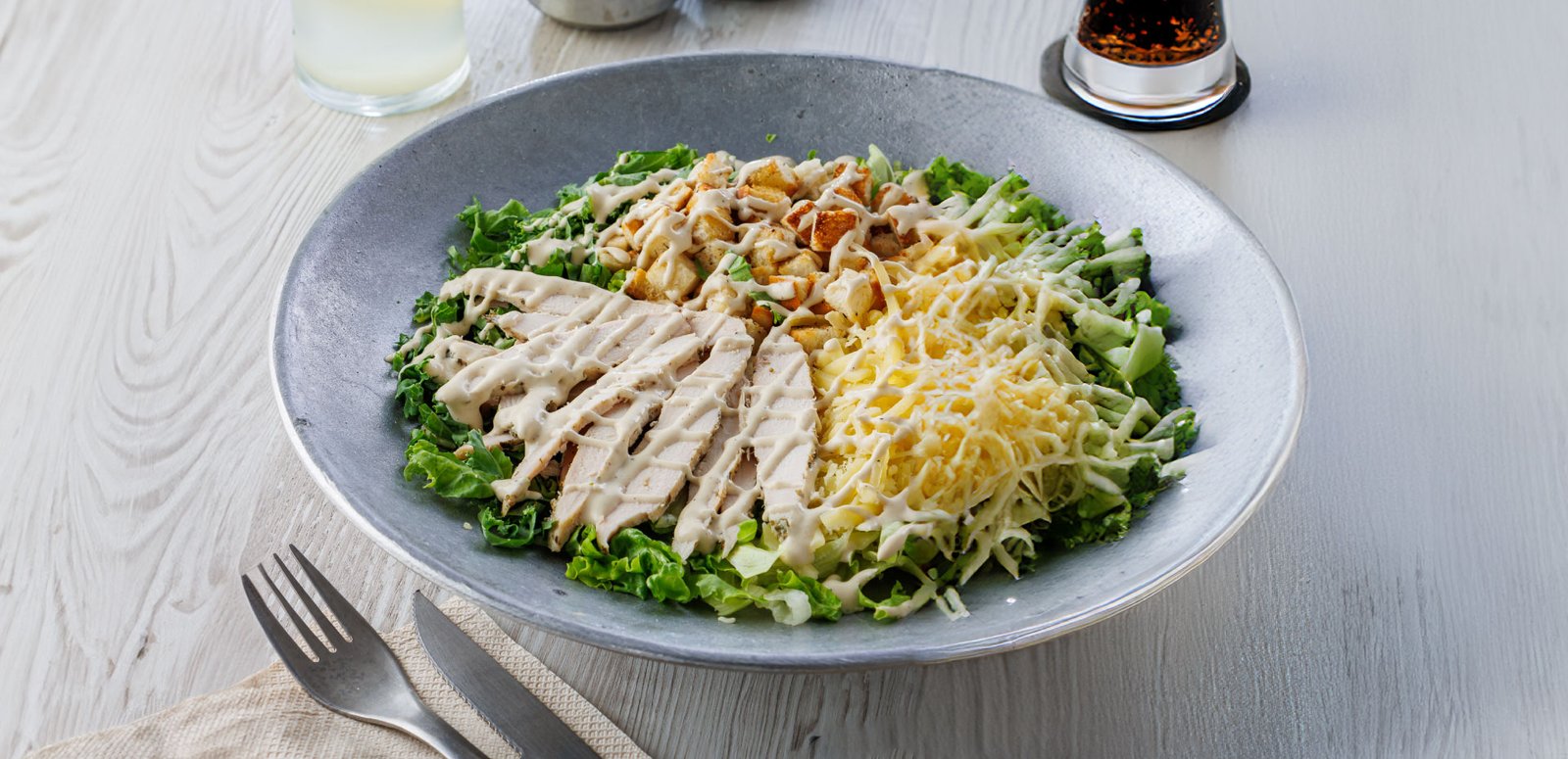 ENSALADA CAESAR | Base de lechuga, croutons, pollo y queso en hebras. Aderezada con salsa Caesar.