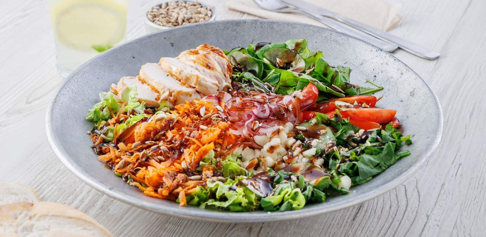 ENSALADA DE LA HUERTA | Pollo, lechuga, rúcula, arroz yamaní, tomate cherry, zanahoria, cebolla morada, pepino agridulce, queso en hebras y semillas de girasol.  Aderezada con reducción de aceto y miel.