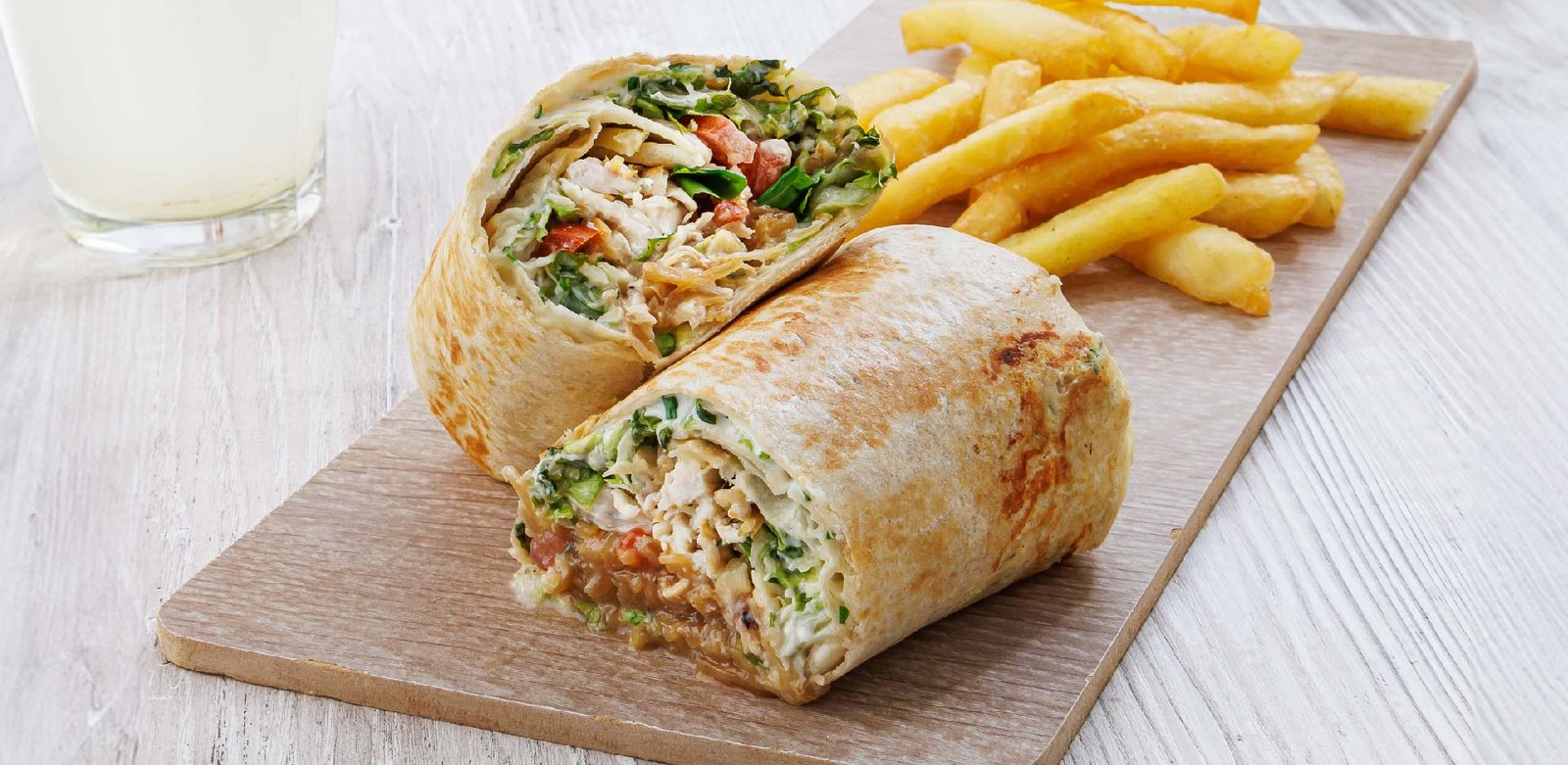 WRAP DE POLLO | Pollo, queso crema y ciboulette, lechuga, tomate, cebolla caramelizada y queso en hebras.