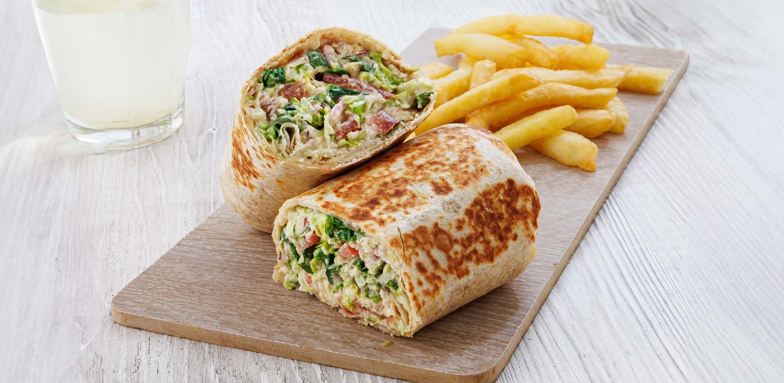 WRAP DE HUMMUS | Pollo, hummus clásico, lechuga, rúcula, arroz yamaní, cebolla morada y tomate.